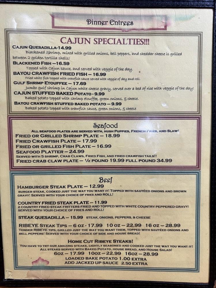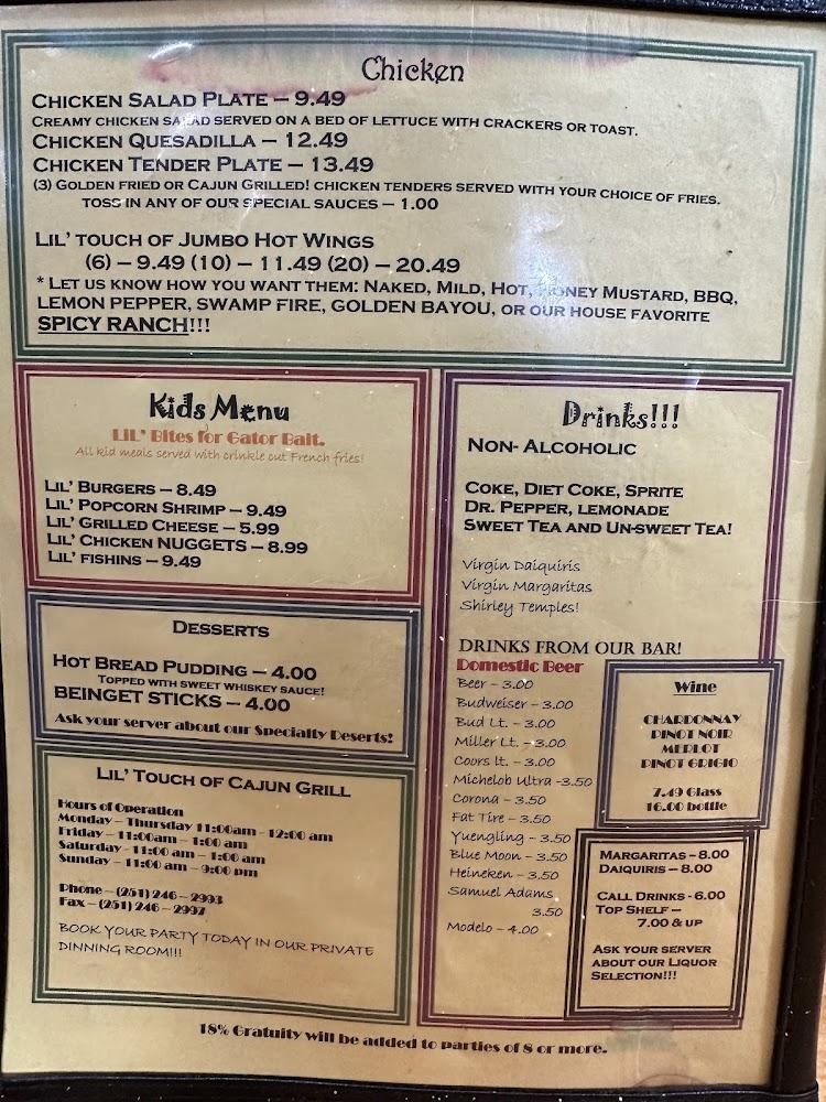 The menu at Lil' Touch Of Cajun Grill showcases a variety of Cajun specialties. Popular dishes include Blackened Fish and the Fried Crab Claw Plate. The balance between seafood and meat options caters to all palates. Most plates are shared sizes, ideal for enjoying family-style meals.